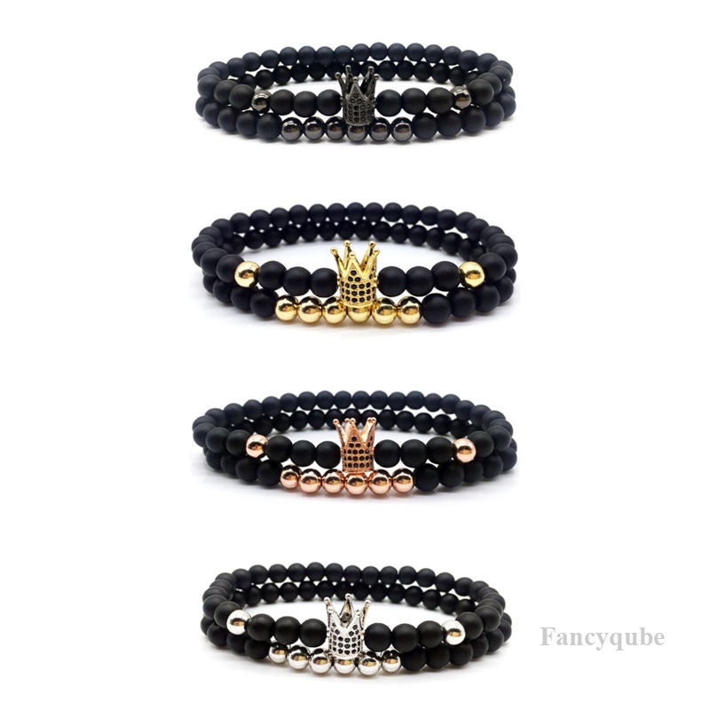 Detail 2pcs/set Gelang Mahkota Manik-Manik Batu Matte Hitam Femme Teman Gelang Untuk Wanita Pria Perhiasan