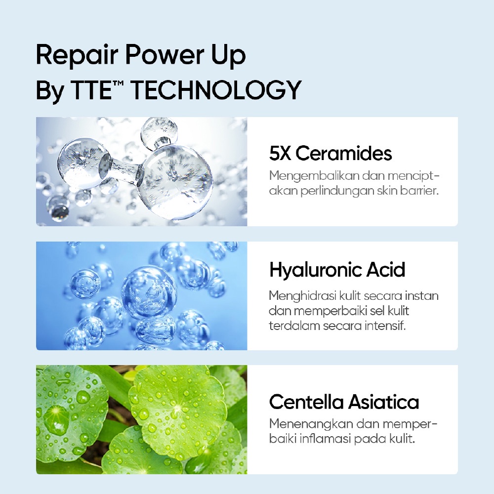 Hero Ingredients: 5X Ceramide: Kombinasi 5 jenis Ceramide untuk mengembalikan dan menciptakan lapisan perlindungan kulit untuk mencegah hilangnya kelembaban Hyaluronic Acid: Menghidrasi kulit secara instan dan secara intensif memperbaiki sel kulit secara mendalam Centella Asiatica: Menenangkan dan memperbaiki inflamasi pada kulit Marine-Collagen: Mempertahankan kelembaban dan kekenyalan kulit