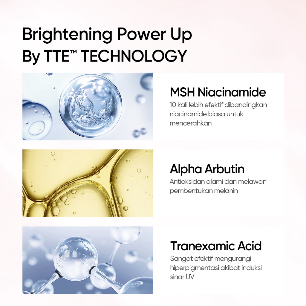 MSH Niacinamide : Niacinamide dengan kualitas premium dengan kombinasi MSH, mencerahkan kulit dengan cepat tanpa menyebabkan iritasi. Alpha Arbutin : Antioksidan alami dan pencerah kulit. sangat efektif dalam pencegahan pembentukan melanin, memperbaiki penampilan bintik-bintik penuaan, bintik-bintik, melasma, dan pigmentasi pasca-inflamasi. Tranexamic Acid : Terbukti secara ilmiah memiliki efek memutihkan, terutama untuk hiperpigmentasi akibat sinar ultraviolet.