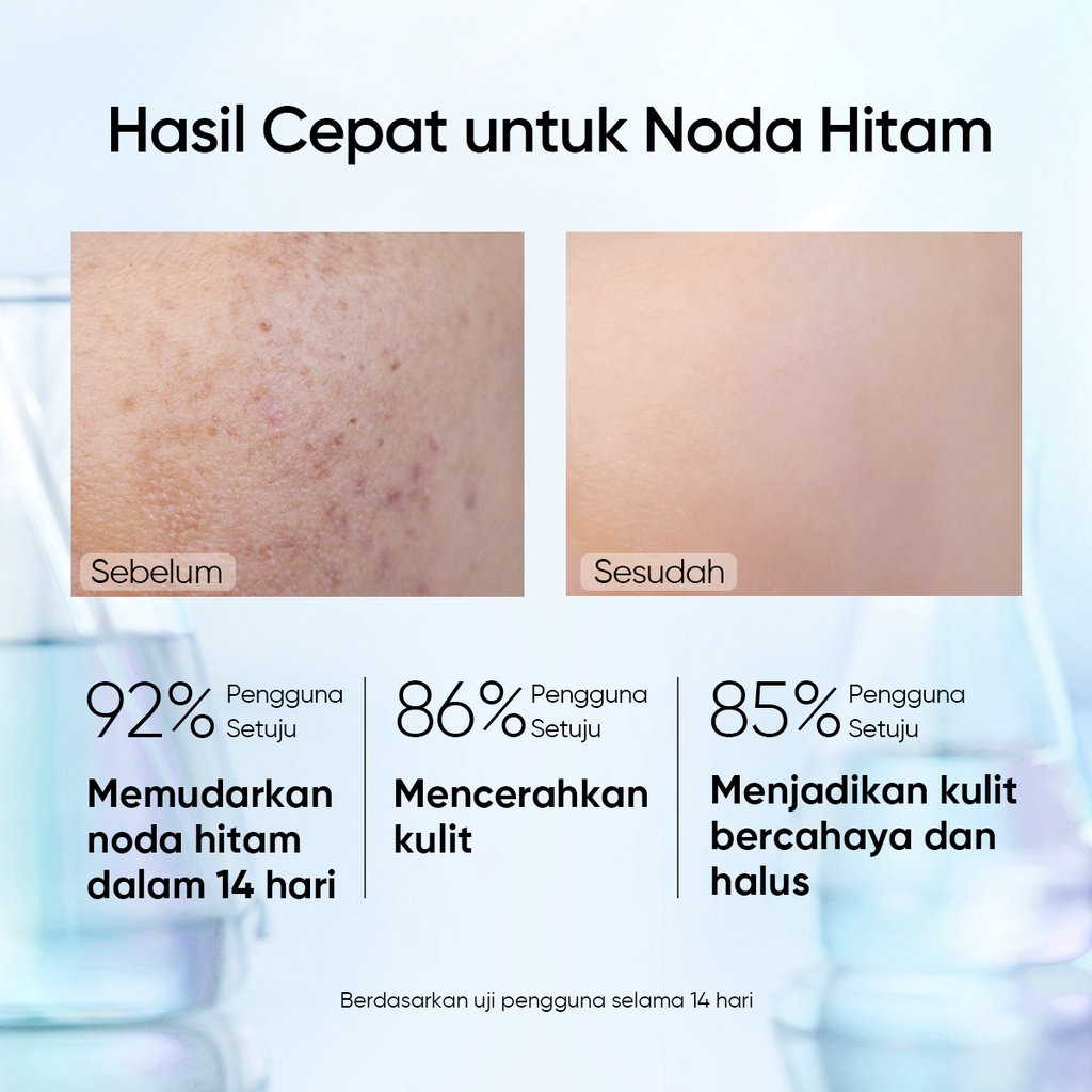 Manfaat: ●Memudarkan noda hitam dan hiperpigmentasi dalam 14 hari ●Mengurangi kemerahan dan bekas jerawat ●Melawan radikal bebas dan mencegah timbulnya iritasi ●Menjaga hidrasi dan kelembapan kulit ●Menjadikan kulit lebih halus & tampak lebih cerah