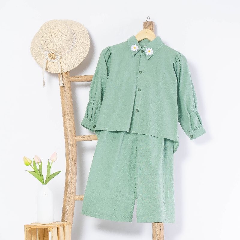 Detail 3-7 Tahun One Set LALUNA LINEN CRINCKLE PURE LINEN Setelan anak Perempuan Kemeja Oversize mix Kulot KOLEKSI PREMIUM