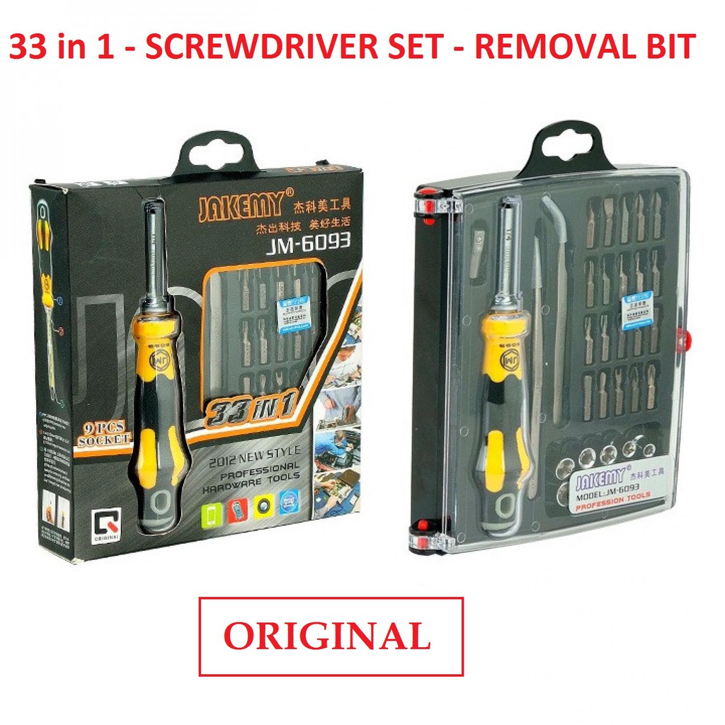 INFORMATION PRODUCT Jakemy 33 in 1 Removal Bit Screwdriver set - JM-6093 A Must Have Repair Tool Kits Jakemy JM-6093 Screwdriver Set hadir dengan 33 jenis kepala obeng dengan kualitas besi yang kuat dan tahan lama. JM-6093 dilengkapi dengan kotak untuk menyimpan kepala obeng dengan design yang ringan, dan mudah dibawa kemana saja.