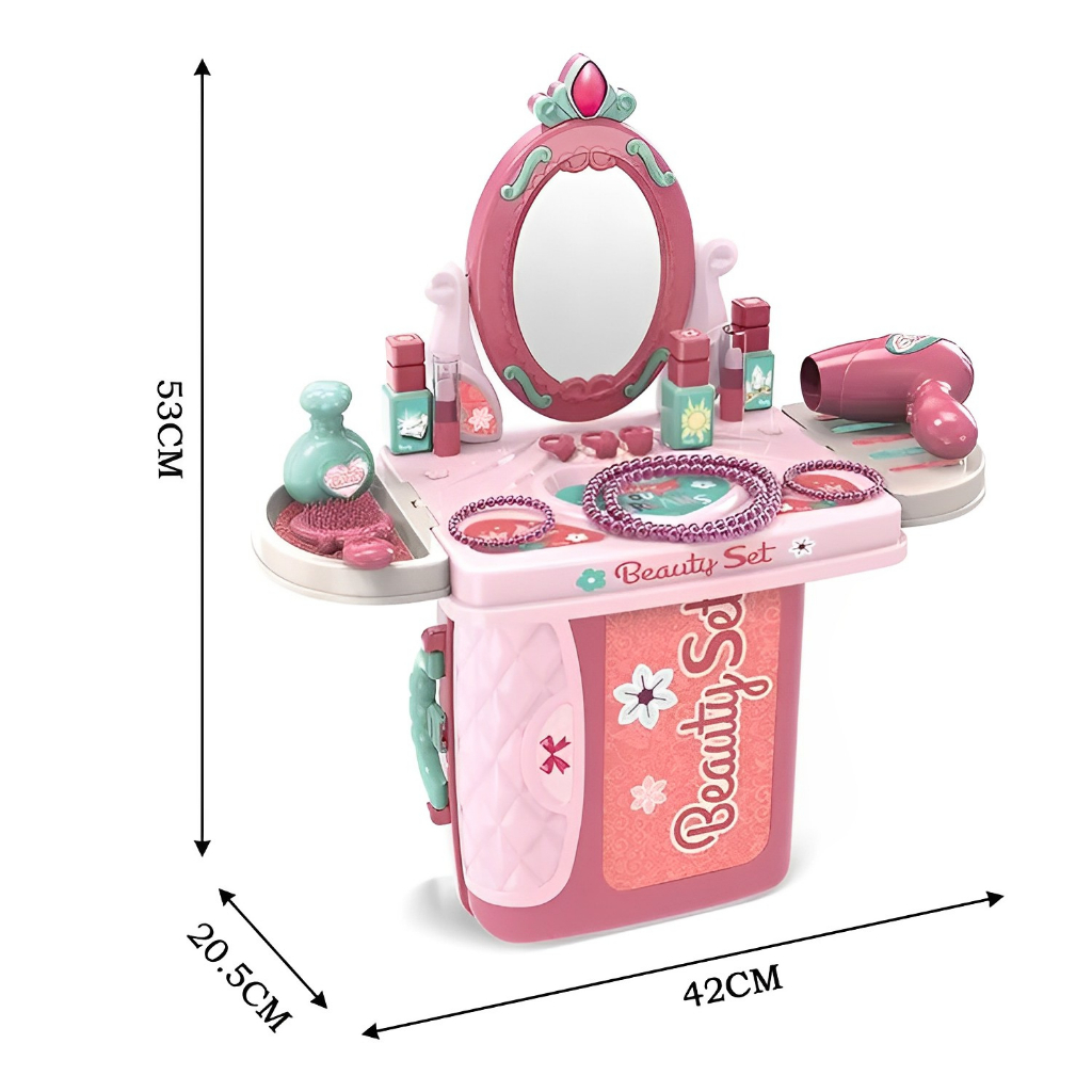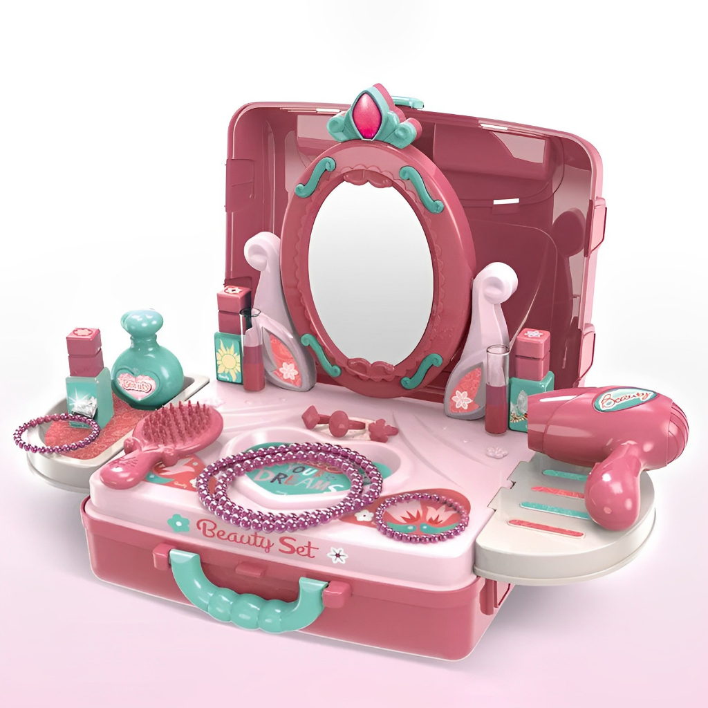 Mainan Anak 3IN1 BEAUTY SET adalah mainan multifungsi untuk anak usia 3 tahun ke atas yang berisi beberapa aksesori alat rias seperti hairdryer, lipstick, gelang, sisir, botol parfum dan lain-lain. Mainan ini dirancang dengan desain yang lucu dan menarik dengan koper yang dapat dijadikan meja rias dan bisa dijadikan tas selempang.