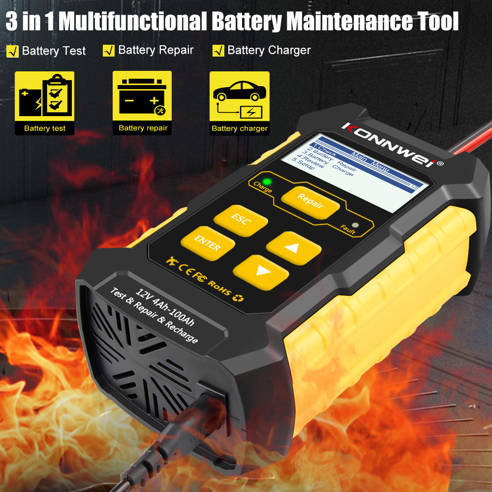 KONNWEI KW510 is a professional battery charging tester, battery charger, battery maintenance (pulse repair), trickle charger and battery desulfator. with high precision features of konnwei battery tester, Kw510 is combing the battery charging and repair function and redesigning the products, makes the all-in-one battery maintenance tool, whcih is very useful and shorten your work and is A tool must have for all car owners.