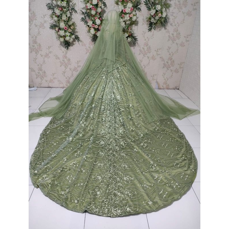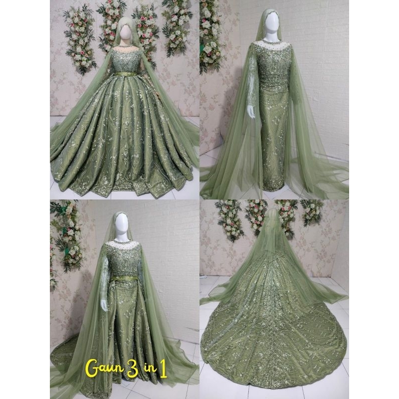 1gaun terdiri dari ๐ rok berbahan dasar lapis BUSA &panjang ekor 2,5m yg bisa dirubah menjadi ballgown ataupun ekor slimgown sesuai selera ๐ slim gown span lurus ๐ veil hijab premium