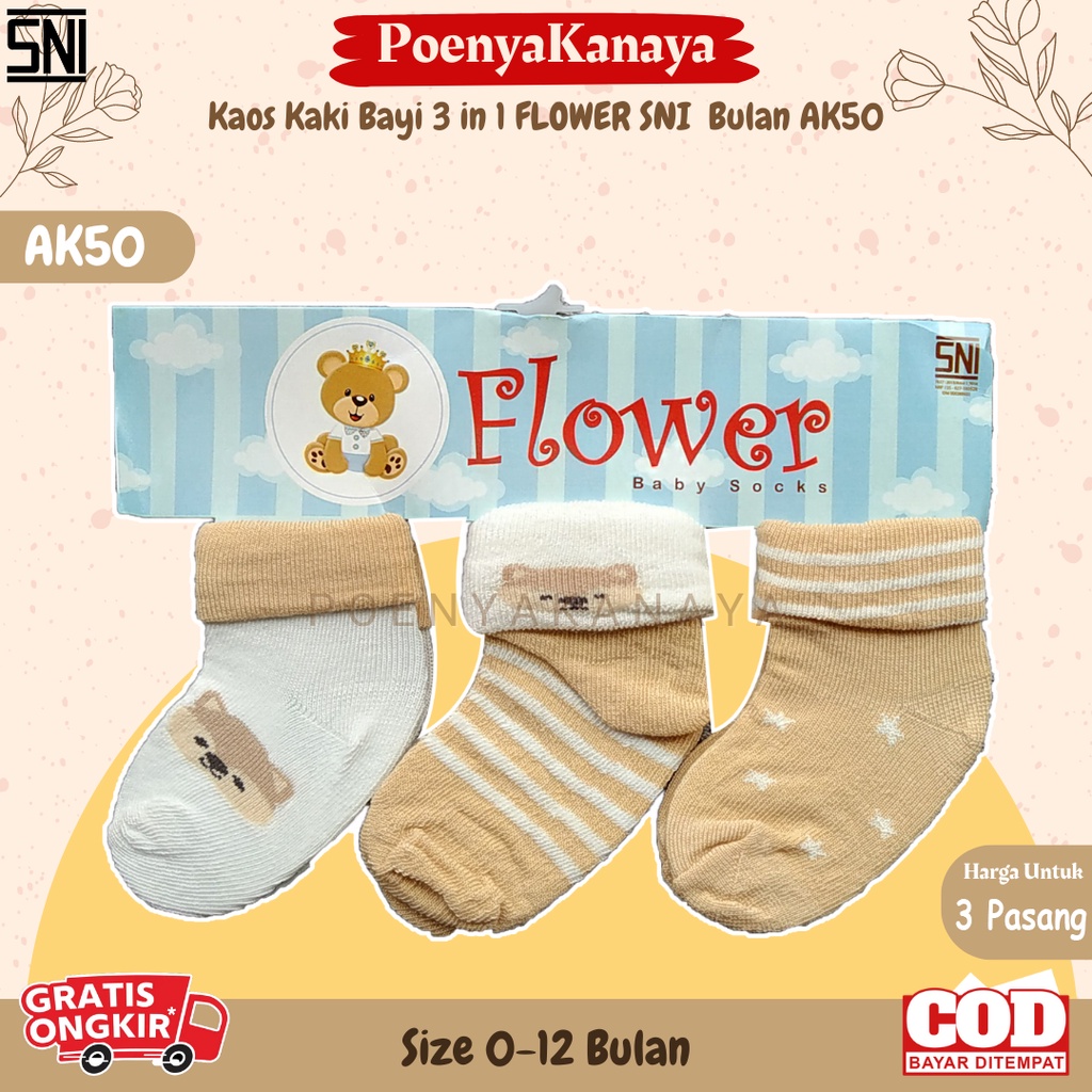 Detail 3Set Kaos Kaki Bayi 3 in 1 FLOWER SNI 0 - 12 Bulan AK50