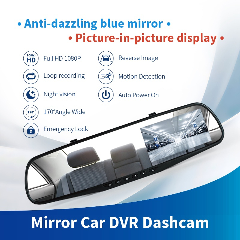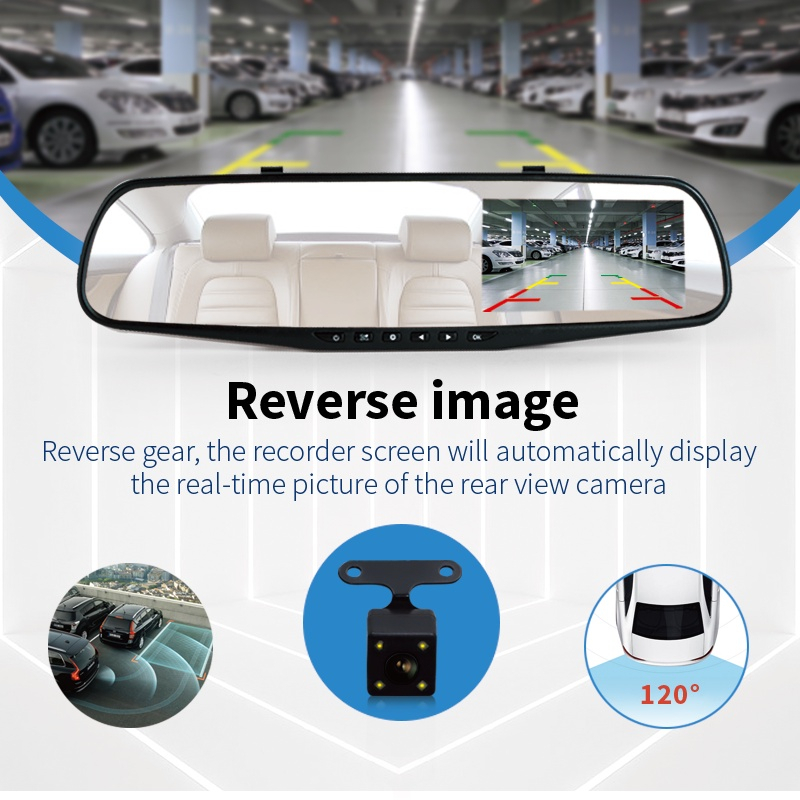 6.Kamera mobil model kaca spion tengah dan layar yang lebar yakni 4.3 2 kamera dan juga mengadopsi lensa wide 170 derajat dengan resolusi 1080P pada kamera depan sehingga hasil rekaman lebih lebar.