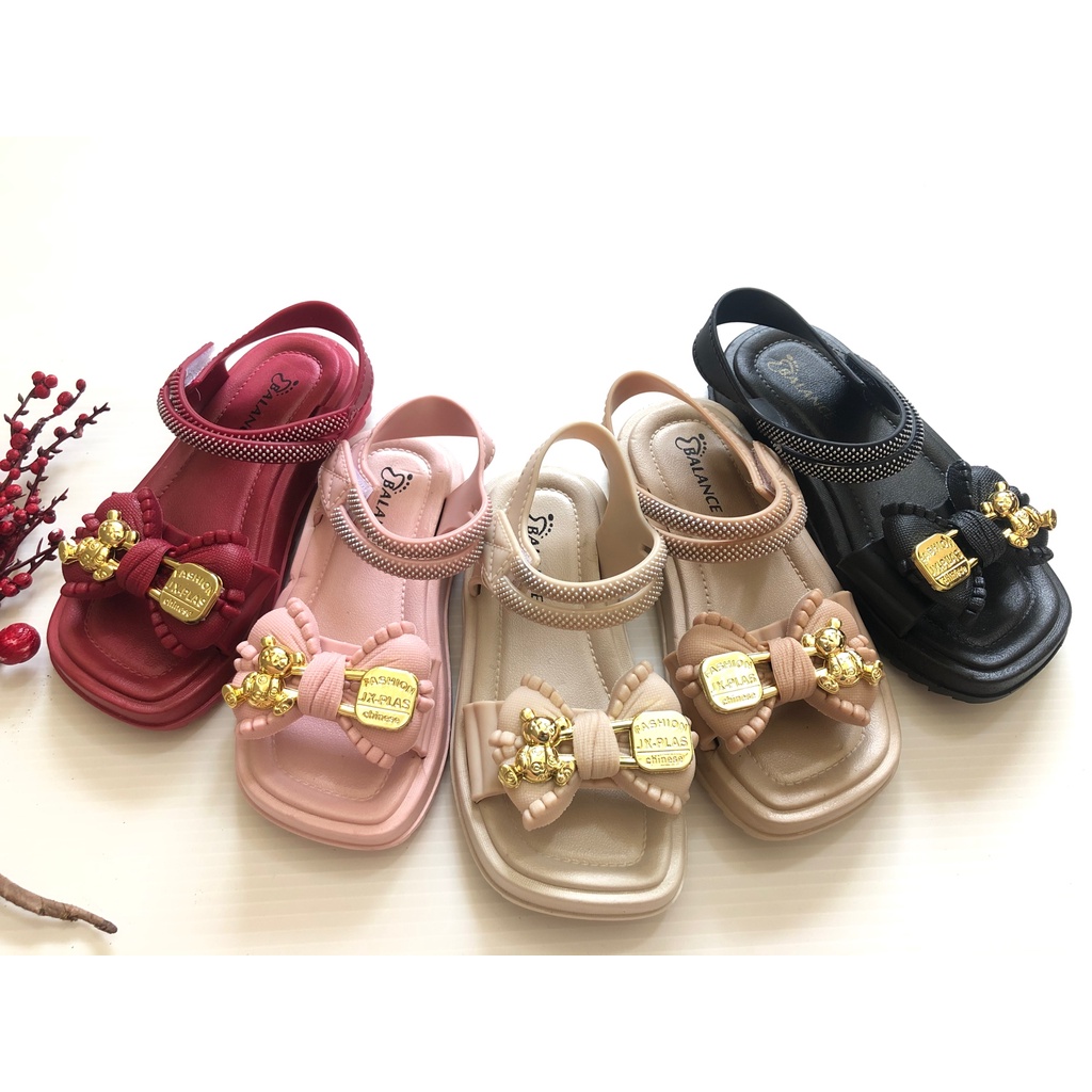 Sandal Anak Perempuan Import - Merk Balance - Bahan Karet Jelly Empuk - Pita Gold Bear (kekinian) - Cocok untuk perkiraan usia 2-8 Tahun