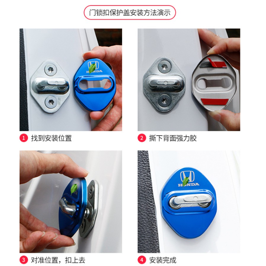 product description: -Original mold for Honda door latch. -Suitable for all Honda cars to prevent the door latch from rusting. -Made of 100% genuine stainless steel, with the highest quality of the laser-engraved Honda logo. -Lasting quality and coverage -Color options: Profusion gold | bright blue | mysterious black | ruby red | silver moon