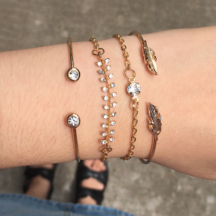 Detail 4 in 1 Gelang Model Terbuka Desain Daun Gaya Bohemian Untuk Wanita