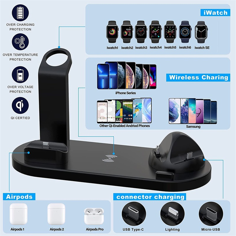 Highlight: • 【4 in 1 Wireless Charger Stand】 Dudukan pengisi daya multifungsi dengan antarmuka Untuk iPhone/Mikro/Tipe-C dapat mengisi daya untuk hampir semua perangkat seluler, seperti Untuk iPhone, Untuk iPad, Untuk Samsung, Untuk LG, Untuk HTC, Untuk Huawei, Untuk Sony, dan dok pengisi daya dapat bebas diputar 360 derajat. • 【Kompatibilitas】 Kompatibel Universal untuk seri iWatch Untuk iWatch 4/3/2/1, untuk Airpods dan untuk iPhone Xs / Xs Max / Xr / X / 8/8 Plus/ untuk Samsung Galaxy S10/S10 Plus/ S9 / S9 Plus / S8 / S8 Plus / S7 / S7 Edge / S6 Edge Plus / Catatan 9 / Catatan 8. • 【Tagih Maju】 Stasiun pengisian daya menggunakan teknologi kontrol otomatis tercanggih. Perlindungan built-in terhadap overcharge, perlindungan arus lebih dan tegangan lebih, kontrol suhu, deteksi benda asing. Lindungi baterai perangkat Anda dari kerusakan overcharge. • 【Kualitas terbaik】 Bahan Silikon Inovatif, Tanpa menggores iphone/iwatch/airpods Anda yang menghalangi layar atau tepi. Menghiasi kamar tidur, ruang belajar, aula, meja kantor Anda dengan sempurna. • 【Instalasi Mudah】 Pasang saja kabel apel asli ke dalam dudukan, lalu dapat berfungsi sebagai dudukan pengisi daya untuk Anda. Sembunyikan kabel panjang yang berlebihan, buat meja atau nakas Anda rapi dan teratur.