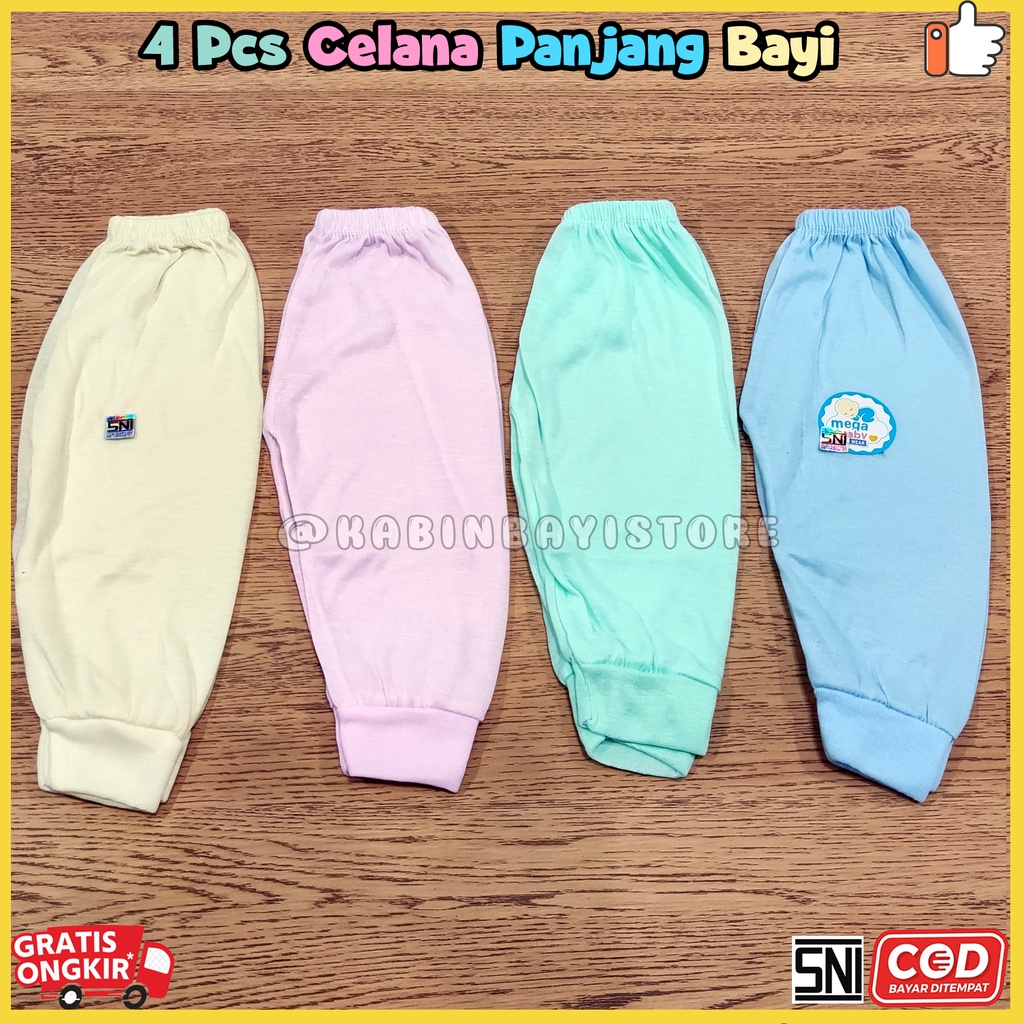 Jumlah item : 4 Pcs celana panjang bayi Warna : Pink. Kuning, Biru, Hijau Bahan : katun nyaman di pakai Usia : 0-3 Bulan Motif : Polos Berat : 125 gram per 4 pcs.