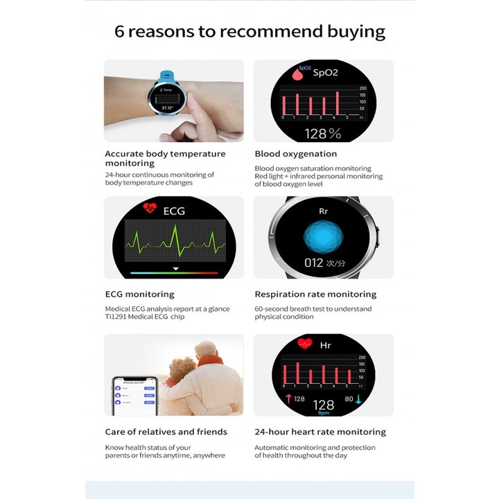 Feature: 1.Full screen and full touch screen 2.Accuate blood oxygen 3.PPG+ECG for accurate blood pressure monitor 4.ECG AI Report 5.Most accurate heart rate monitor 6.24 hours temperature monitor 7.Temperature monitor Alarm ( thermometer for body ) 8.Remote family health data share 9.Top waterpoof reach IP67