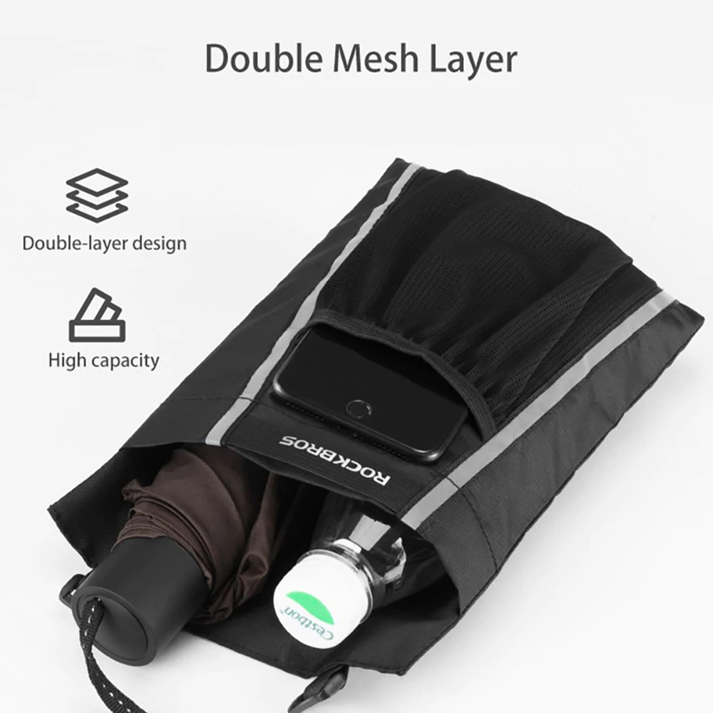 Features: Multi - scene can be used, bicycles, electric bikes, motorcycles, scooters and so on. Large capacity, can store all kinds of small items, such as: mobile phone, keys, umbrella, drinks and so on. Double bag design, effectively improve storage space. V elcroband fastening, quick installation, more convenient. Triangle fixed, more solid, bearing force. Anti - tear material, can bear 5 kg. Velcroseals to prevent items from falling off during cycling, making it safer. Reflective design makes night riding safer. Breathable mesh bag design, can store mobile phone, easy to take.