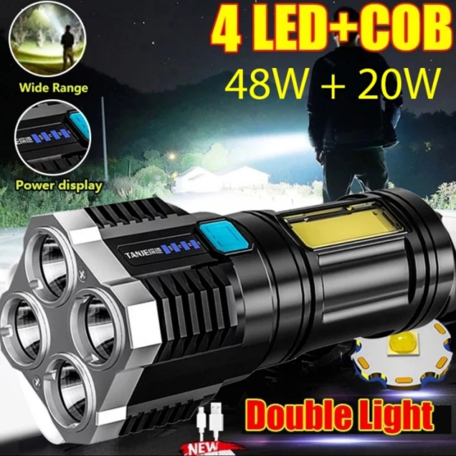 Senter dengan 4 mata LED dan lampu COB (pada bagian samping) memiliki cahaya super terang dan dapat diisi ulang (rechargeable) dengan lampu indikator status baterai 4 tahap untuk mengingatkan pengisian daya tepat waktu. Tersedia 4 mode pencahayaan, Nyala Terang, Nyala Redup, Mode SOS, Nyala Samping. Terbuat dari bahan berkualitas, senter ini terjamin kokoh dan tidak ringkih. Senter portable dan ringan sangat ideal untuk penggunaan di dalam maupun di luar ruangan seperti berkemah, hiking, memancing ataupun dalam keadaan darurat.