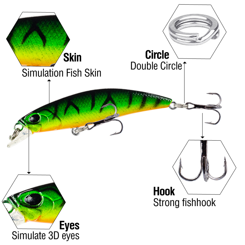 1, Konstruksi ABS yang tahan lama, umpan bass pelindung yang dapat digunakan kembali & lingkungan, dicurangi dengan pengait treble tajam tahan karat, membuatnya alat menangkap pancing yang kuat.