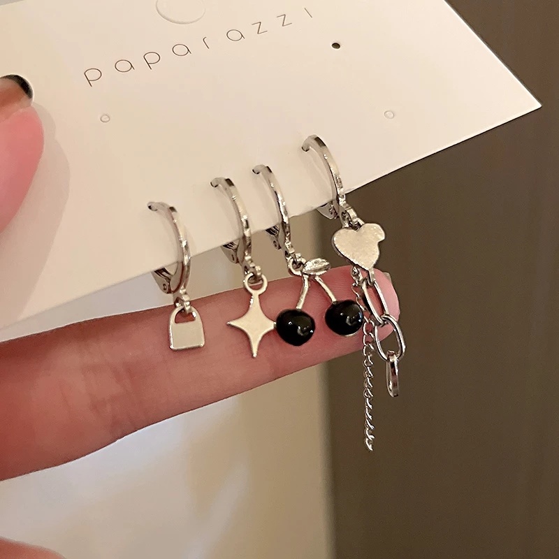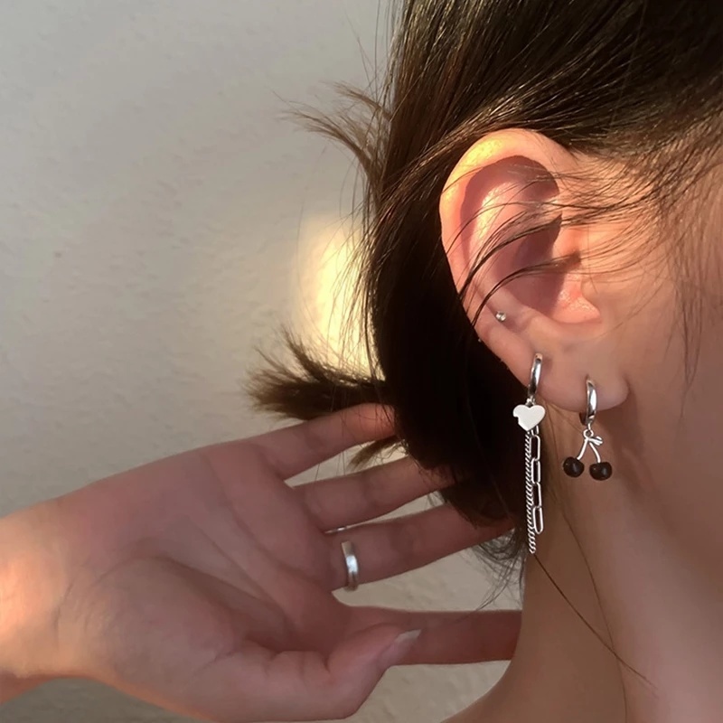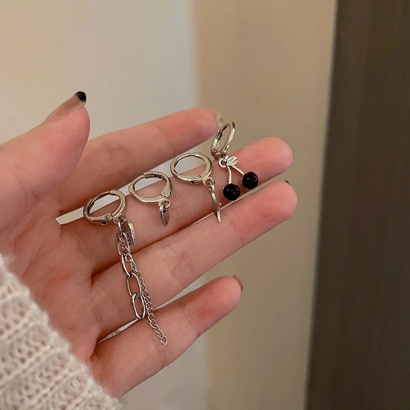 Detail 4pcs / set Anting Tusuk / Bulat Asimetris Desain Hati / Cherry / Geometri + Rantai Rumbai Warna Silver Untuk Wanita
