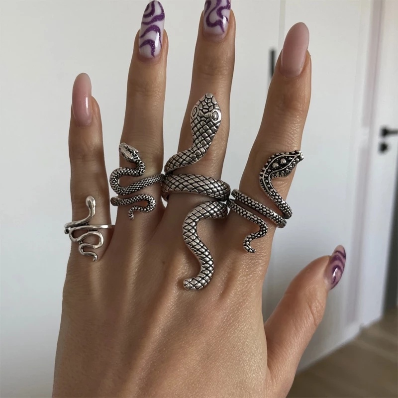 Spesifikasi Bahan: Paduan Kategori: Cincin Warna: Emas, Perak, Hitam Gaya: fashion Bentuk: Ular Ukuran: sekitar 1.8 cm Jumlah: 1 set isi 4 cincin Aplikasi: harian, belanja, pesta Paket termasuk: 1 * set cincin