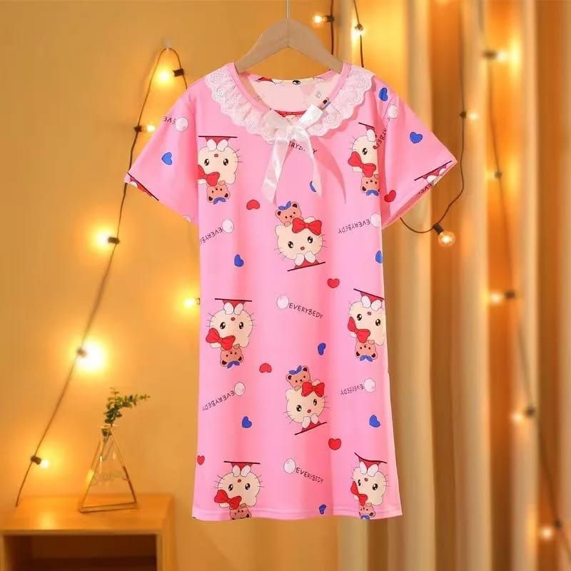 [5-12Th] baju tidur daster dress leher renda kartun karakter import 5 6 7 8 9 10 11 12 tahun xs-0308r / piyama daster anak import printing karakter kartun 5 - 12 tahun