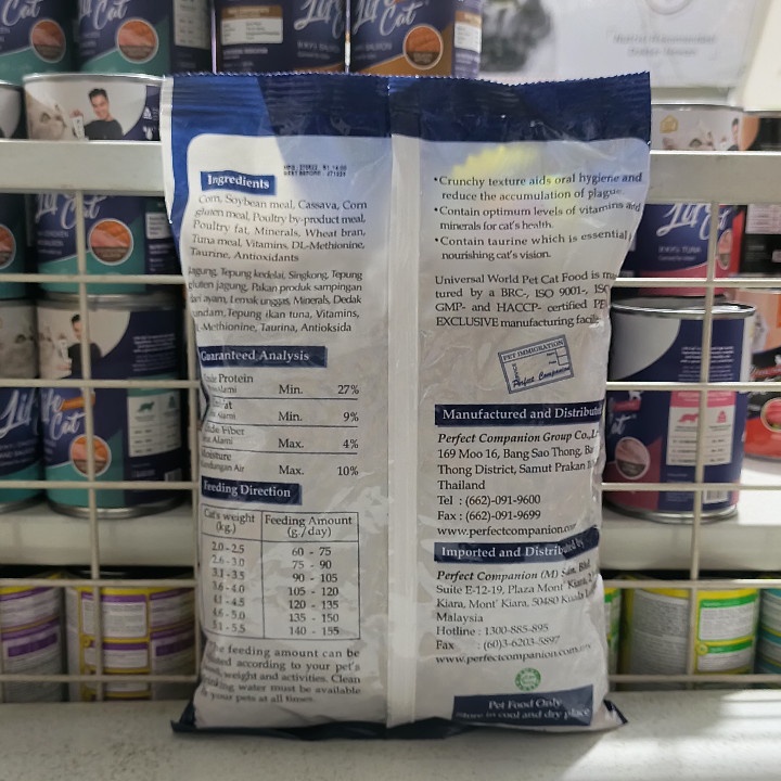 Universal Tuna Cat Food merupakan makanan kucing kering produksi Universal World Pet, Thailand. Produk ini diformulasikan dengan perpaduan kandungan formula terbaik dan cita rasa tuna yang sangat disukai oleh kucing. Sangat cocok dijadikan sebagai salah satu makanan favorite untuk mendukung tumbuh kembang kucing kesayangan Anda.