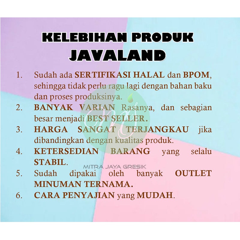 Cara Penyajian Ice Blend : 1. Masukkan 25Gr - 30Gr bubuk JAVALAND, 250 Ml Air, Es batu secukupnya dan 30 Ml Gula Cair/ 2 sendok Gula Pasir ke dalam Blender. 2. Blender semua bahan hingga tercampur rata. 3. Tuang Ice Blend kedalam cup gelas minuman ukuran 14-16 oz dan siap dinikmati. Milk Shake : 1. Masukkan 25 Gr - 30 Gr bubuk JAVALAND, 100 Ml Air, Es Batu Secukupnya dan 20 Ml Gula Cair ( ditambah CREAMER BUBUK atau SKM ( Susu Kental Manis ) lebih enak ). 2. Masukkan semua ke Gelas Shaker, dan Kocok 5-10 detik. 3. Tuang Milk Shake Yang sudah dikocok kedalam gelas minuman ukuran 14-16 oz dan siap dinikmati. Perasa Makanan : Untuk perasa kue bisa langsung dimasukkan ke dalam adonan kue yang diinginkan untuk takaran sesuai selera. Bisa digunakkan untuk perasa diberbagai macam kue antara lain kue cubit, martabak manis, bolu kukus, cake dan lain2nya.