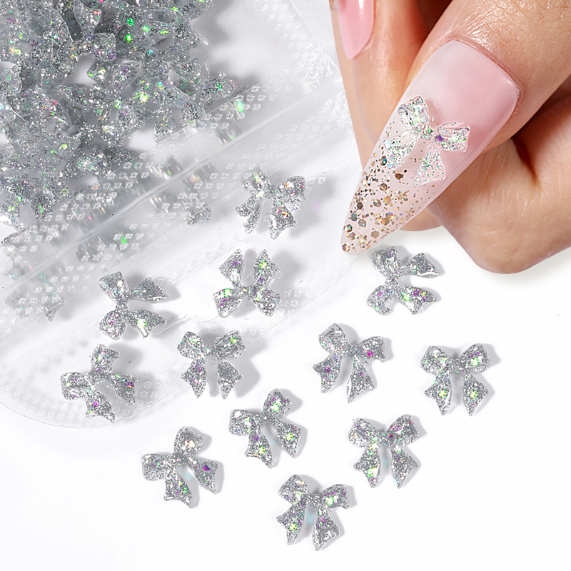 Detail 50pcs/bag Ikatan Simpul Glitter Nail Art Dekorasi Busur Pesona Kuku 3D Kristal Glow-In-Dark Desain DIY Aksesoris Kuku
