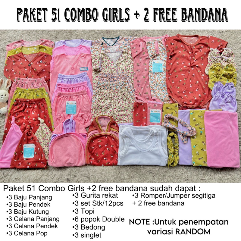 paket 51 Girls + Free 2 bandana : 3 baju Panjang 3 baju pendek 3 baju kutung 3 celana panjang 3 celana pendek 3 celana pop 3 gurita rekat 3 set stk 6 popok Double 3 Singlet 3 Bedong 85*97cm 3 Jumper +free 2 bandana