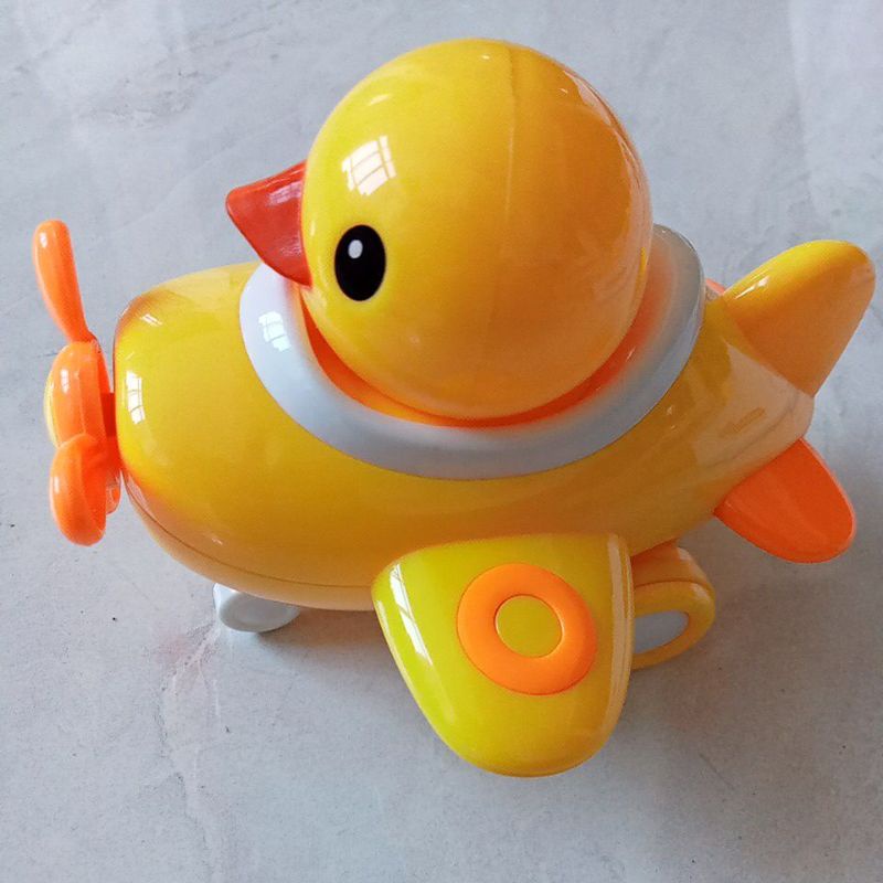 Mainan anak bebek naik pesawat warna kuning mesin tanpa baterai tenaga friction kepala geleng geleng bahan asli bagus sekali, bahan import dijamin awet dan dijamin mantul deh (OBRAL)