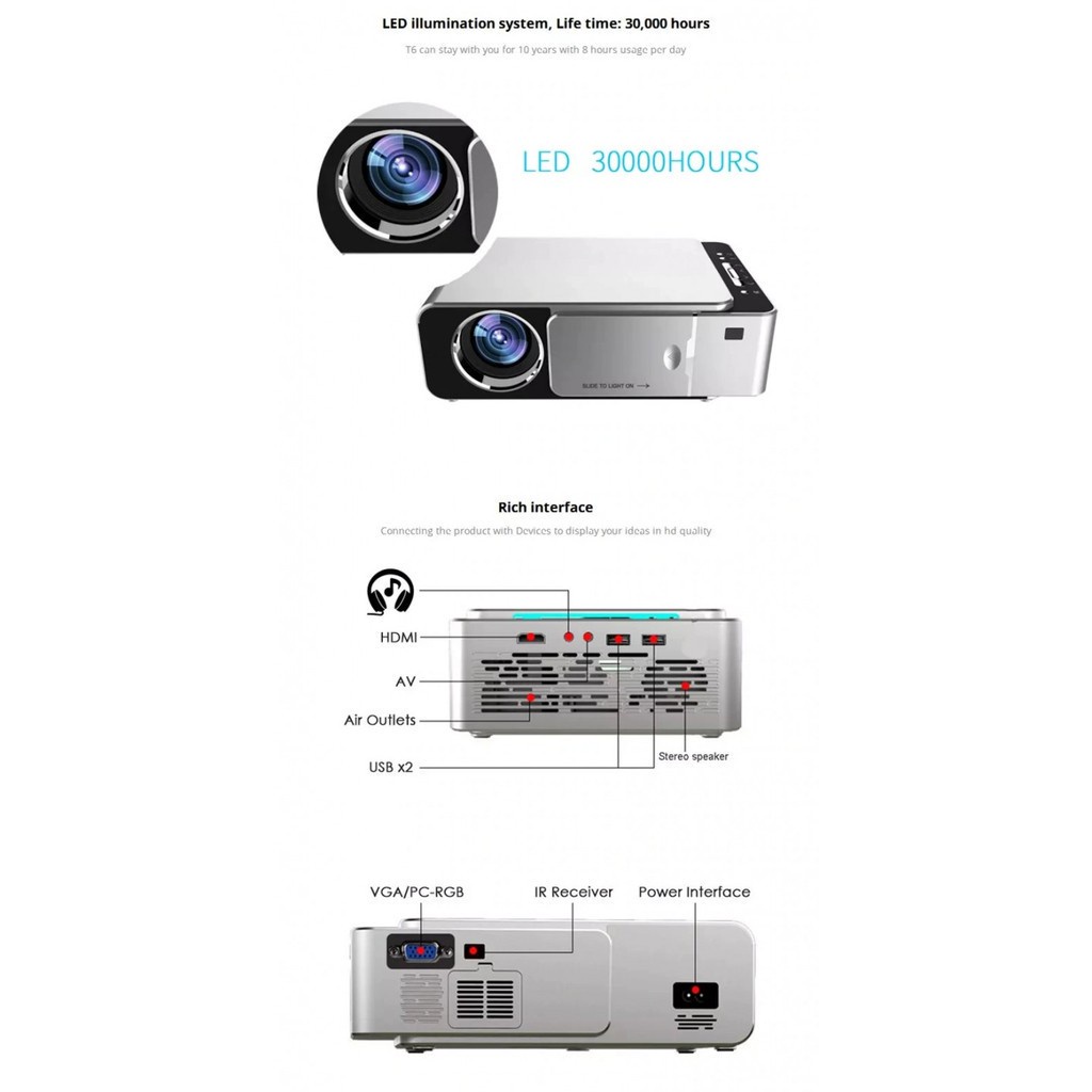 UNIC T6 ini hadir dalam berbagai kelebihan yang sudah dirancang secara matang oleh UNIC. Dikenal dengan model T6, proyektor ini menggunakan lampu LED sebagai sumber proyeksinya, dengan maksimal tingkat keterangan hingga 3500 lumens dan contrast ratio 3000:1. Lampu LED nya sendiri didesain sedemikian rupa agar tidak memberi efek samping pada mata anda. Bekerja dengan resolusi 1280x720p. Tapi, anda juga dapat memproyeksikan hingga resolusi 1080P. Aspek rasio antara 4:3 dan 16:9. Untuk mendapatkan hasil proyeksi yang maksimal, anda hanya perlu meletakkan T6 ini dengan jarak antara 1-4m sehingga hasilnya bisa terproyeksi antara 30-170 inch.