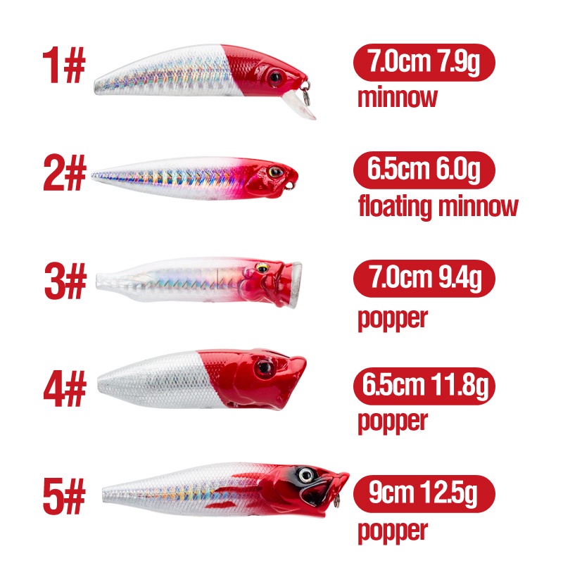 5pcs / Kotak Umpan Pancing Ikan Minnow 7.9 / 6 / 9.4 / 11.8 / 12.5g Bahan Plastik Keras 5 Warna