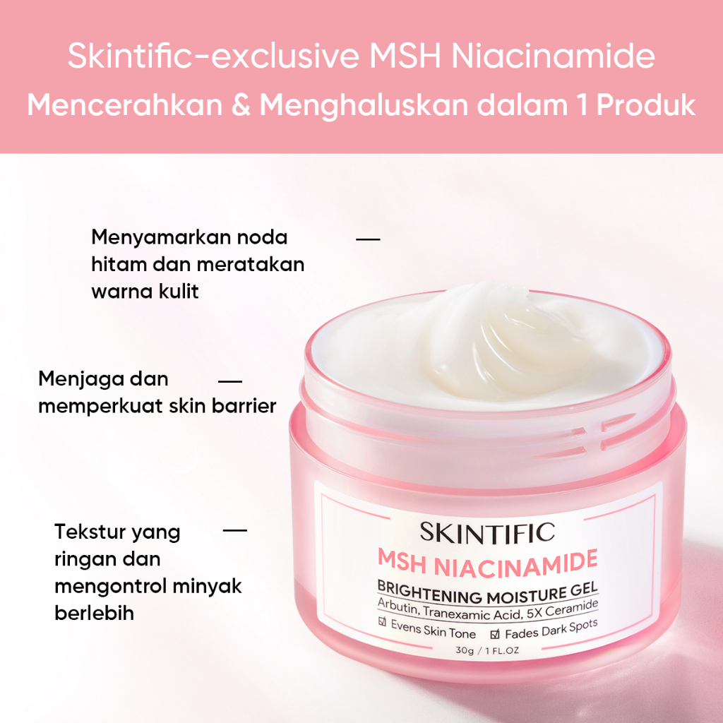 Skintific MSH Niacinamide Brightening Moisture Gel MSH Niacinamide Brightening Moisture Gel dengan tekstur seringan udara, dapat menyerap dengan cepat dan mengontrol minyak dalam 24 jam. Diformulasikan dengan Novel MSH Niacinamide ekslusif SKINTIFIC yang dikombinasikan dengan dua bahan pencerah yang ringan dan paling efektif yaitu Alpha Arbutin dan Tranexamic Acid, yang mampu mencerahkan dengan signifikan dalam waktu 14 hari. MSH Niacinamide terbukti secara klinis 10 kali lebih efektif dibandingkan niacinamide biasa dalam mengurangi hiperpigmentasi, meredakan kemerahan dan meningkatkan elastisitas kulit. Diperkaya dengan Centella Asiatica dan 5X Ceramide, tidak menyebabkan iritasi serta memberikan efek menenangkan kulit sekaligus meningkatkan dan menjaga skin barrier. Ukuran: 30 ml No BPOM: NA11220100291