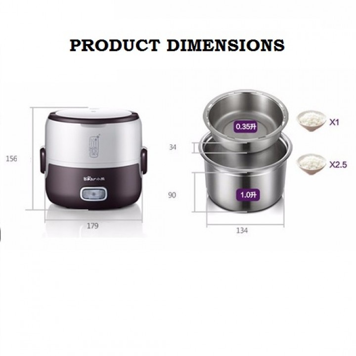 Isi dalam kemasan 1x Electric Thermo Lunch Box 1x Stainless Steel Pot 1L (13.4 x 9 cm) 1x Stainless Steel Pot 0.35L (13.1 x 3.7 cm) 1x Measuring Glass 1x Power Cord 1x Egg Steamed Rack 1x Carrying Bag