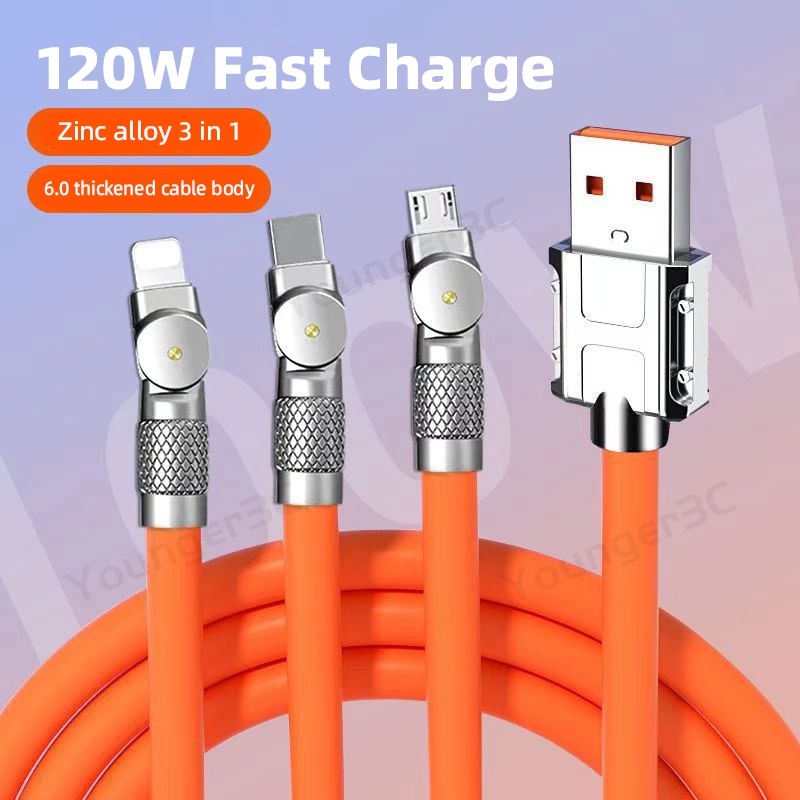 Detail 6a 180°Rotasi Kabel Pengisian Super Cepat 120W Zinc Alloy Charging Cord 3in1 Rotating Silicone Charging Wire Untuk ios Tipe C Android