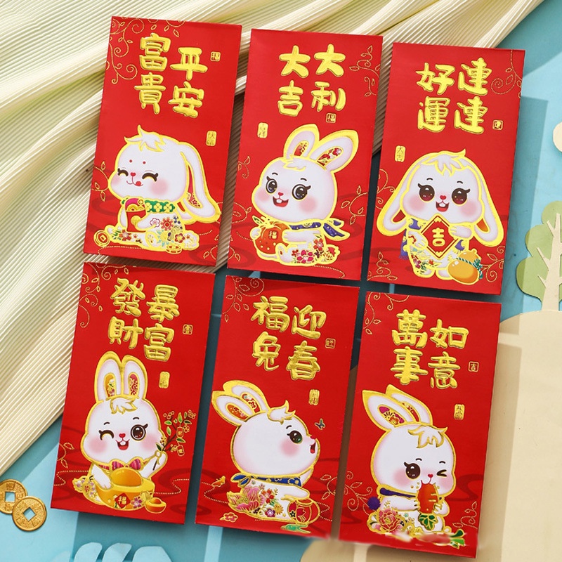 Detail 6pcs 2023CNY Tas Hadiah Tahun Baru Imlek Gambar Kartun Kelinci Warna Merah