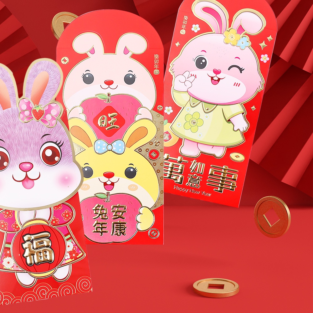 Detail 6pcs Amplop Angpao Tahun Baru Cina / Imlek 2023 Motif Kartun Kelinci Warna Merah