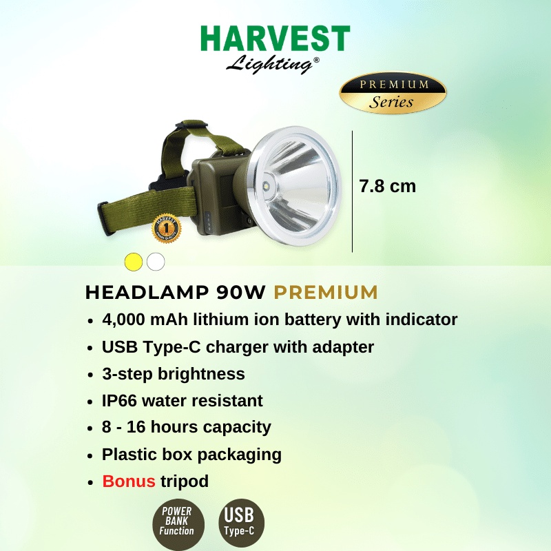 Headlamp HARVEST LIGHTING tipe 90W Premium Series merupakan senter kepala berkualitas tinggi dengan kapasitas baterai 4,000 mAh sehingga dapat menyala terang selama 16 jam terus menerus.