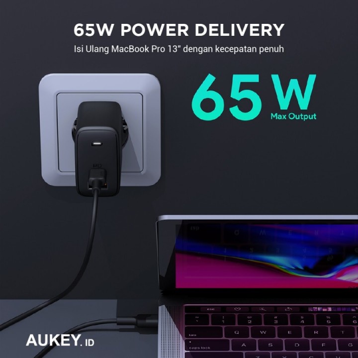 Brand: AUKEY Product Name: OMNIA MIX 65W - Dual PD Charger 65W (MAX) Product Model: PA-B3 Input: AC 100-240V, 50/60Hz; 1.5A USB-C Output 1 (PD 3.0): DC 5V/3A, 9V/3A, 12V/3A, 15V/3A, 20V/3.25A USB-A Output: DC 5V/2.4A, 9V/2A, 12V/1.5A Max. Power Output: 65W Technology: Power Delivery 3.0, GaN Power Technology, Dynamic Detect