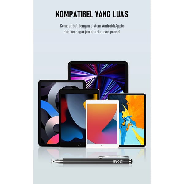 Spesifikasi: Brand : ROBOT Item Code : RSP02 Produk Name : Universal Passive Stylus Pen Color : Black Wrtten Storke : 25 Kilometers Produk Size : 127*9mm Produk Weight : 13g Pen Body Material : Aluminum Alloy Support System : Android , Mac OS , Windows