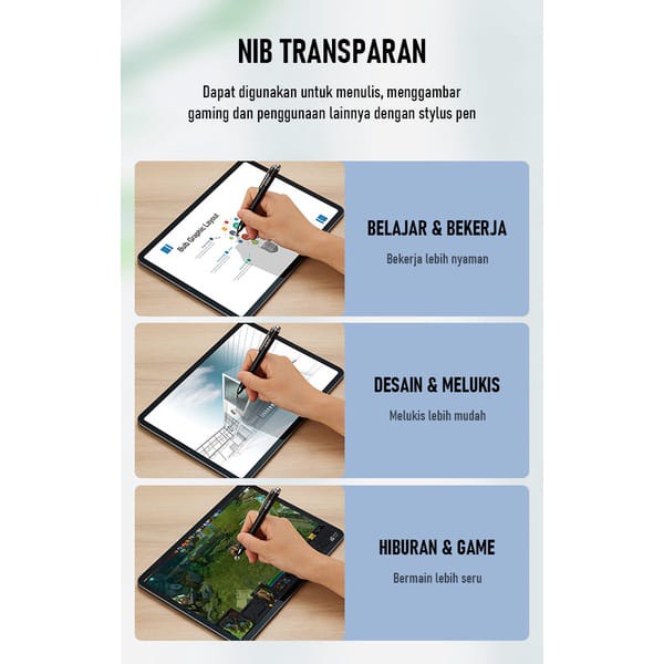 Kegunggulan: 1. Portable universal stylus pen 2. Kompatibel yang luas 3. Sensitif, no delay , no slip 4. Sentuhan yang lebih akurat ,ujung pen yang bulat dan dapat dimiringkan hingga 180° Nibs Ujung Tipis : untuk menulis dan menggambar Nibs Ujung Bulat :untuk gaming dan pengguna umum 5. Penutup Magnet ,melindungi ujung nib pen dengan aman