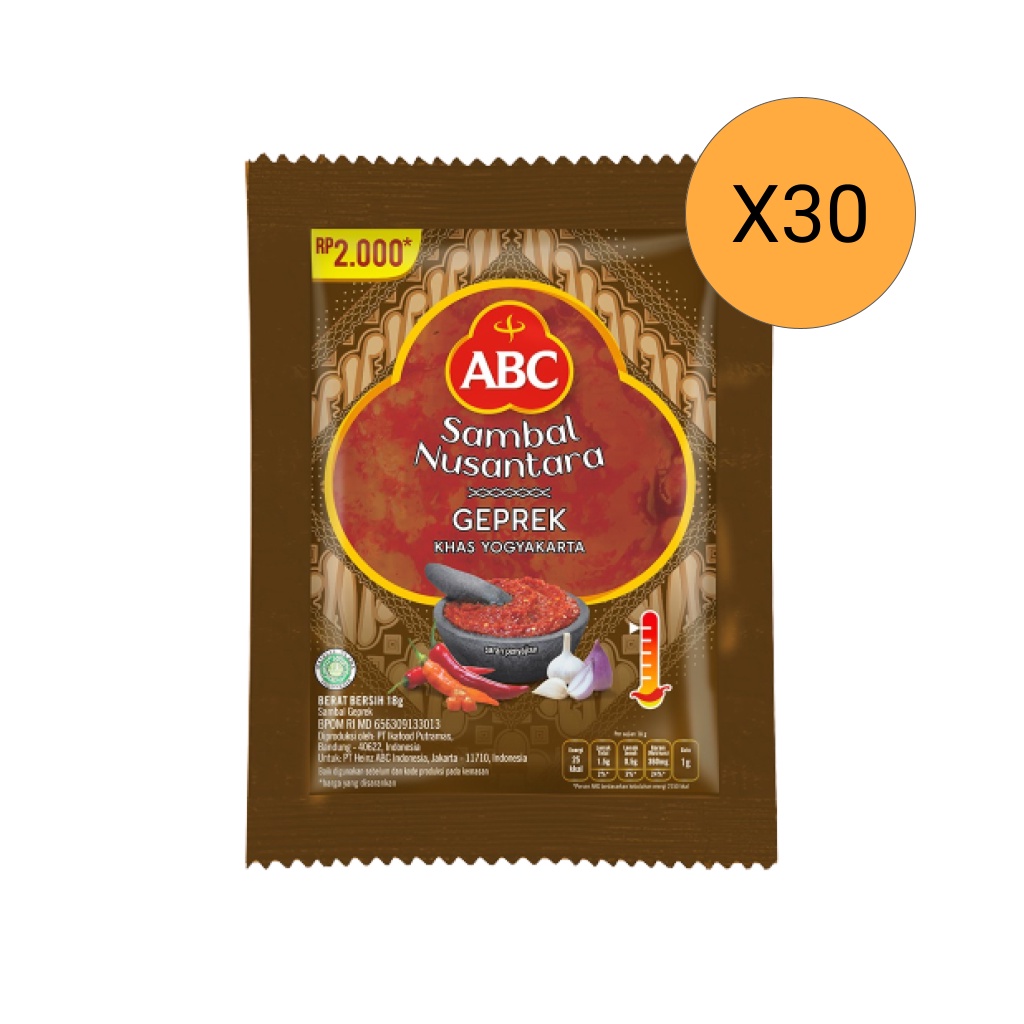 ABC Sambal Nusantara Geprek 30 x 18 g merupakan sambal khas Yogyakarta dengan kemasan sachet yang praktis untuk dikonsumsi. Dibuat dari cabai dan bawang putih yang harum, sambal ini memberikan rasa pedas yang sangat istimewa. Dengan cita rasa yang sesuai lidah orang Indonesia, sambal ini sangat pas disajikan dengan berbagai kuliner khas nusantara untuk membuat momen makan bersama keluarga lebih berkesan. Ayam geprek dan sayur lalapan adalah contoh makanan yang sangat cocok dipadukan dengan sambal ini.