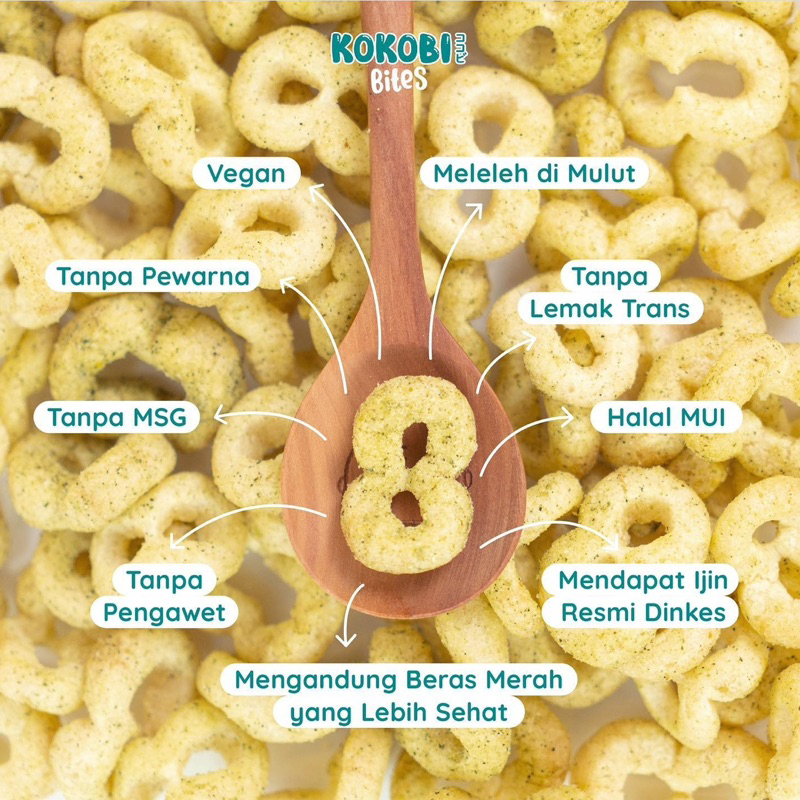 Kokobi Bites dibuat menggunakan campuran tepung beras putih, tepng beras merah dan tepung jagung yang di panggang menghasilkan tekstur yang mudah lumer dimulut. Produk dibuat dengan bahan alami tanpa menggunakan MSG, pemanis buatan, pewarna artifisial, maupun pengawet sehingga aman dikonsumsi untuk anak-anak dan dewasa.Tersedia 5 rasa varian yaitu :