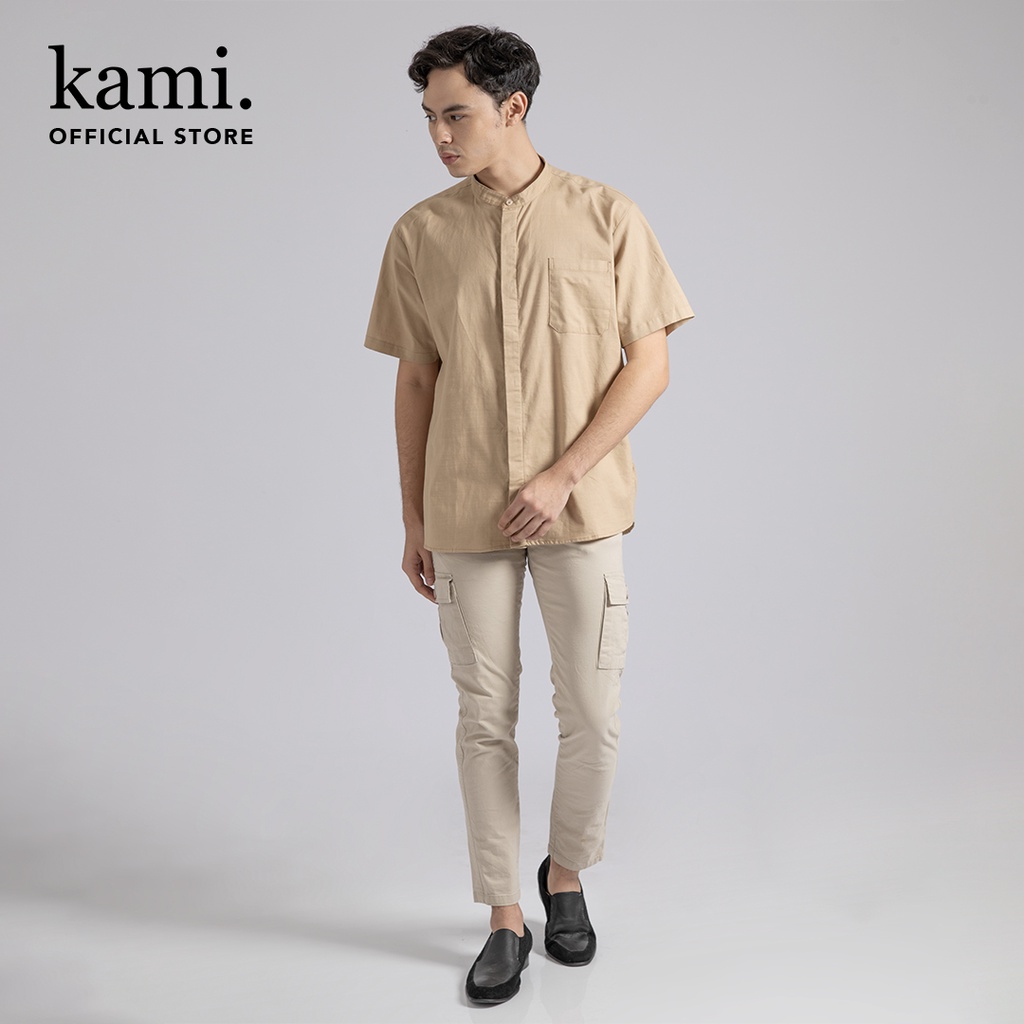 Kemeja kancing berbahan katun linen dengan kerah tanpa daun, saku, dan lengan pendek.