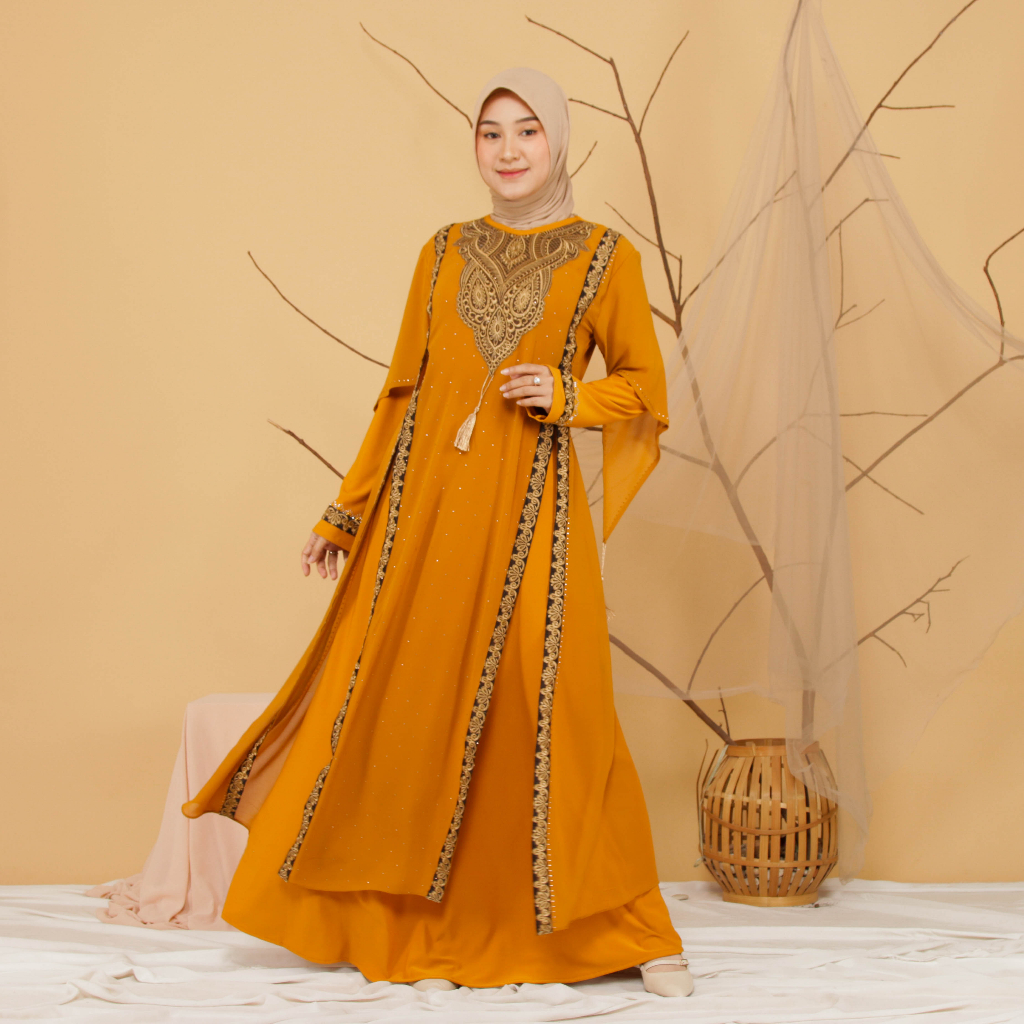 Abaya ini dibuat menggunakan bahan jersey dan ceruty. Kami memakai bahan jersey berkualitas tinggi, bahannya cukup tebal, tidak nerawang, adem, halus, dan nyaman dipakai. Bahan ceruty-nya juga halus, jatuh, dan tidak mudah kusut. Abaya ini dipercantik dengan renda/bordir tempel dan mote swarovsky. Cocok dipakai untuk pesta, arisan, ataupun acara formal.