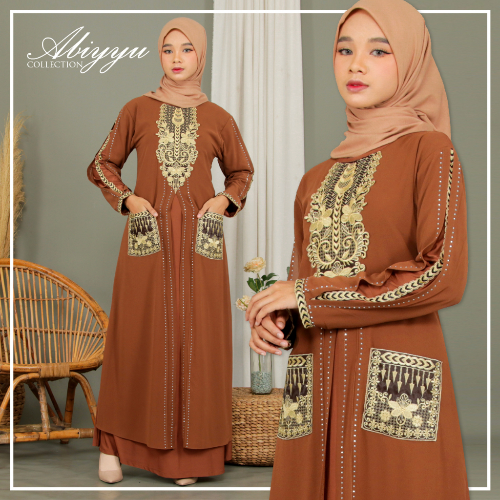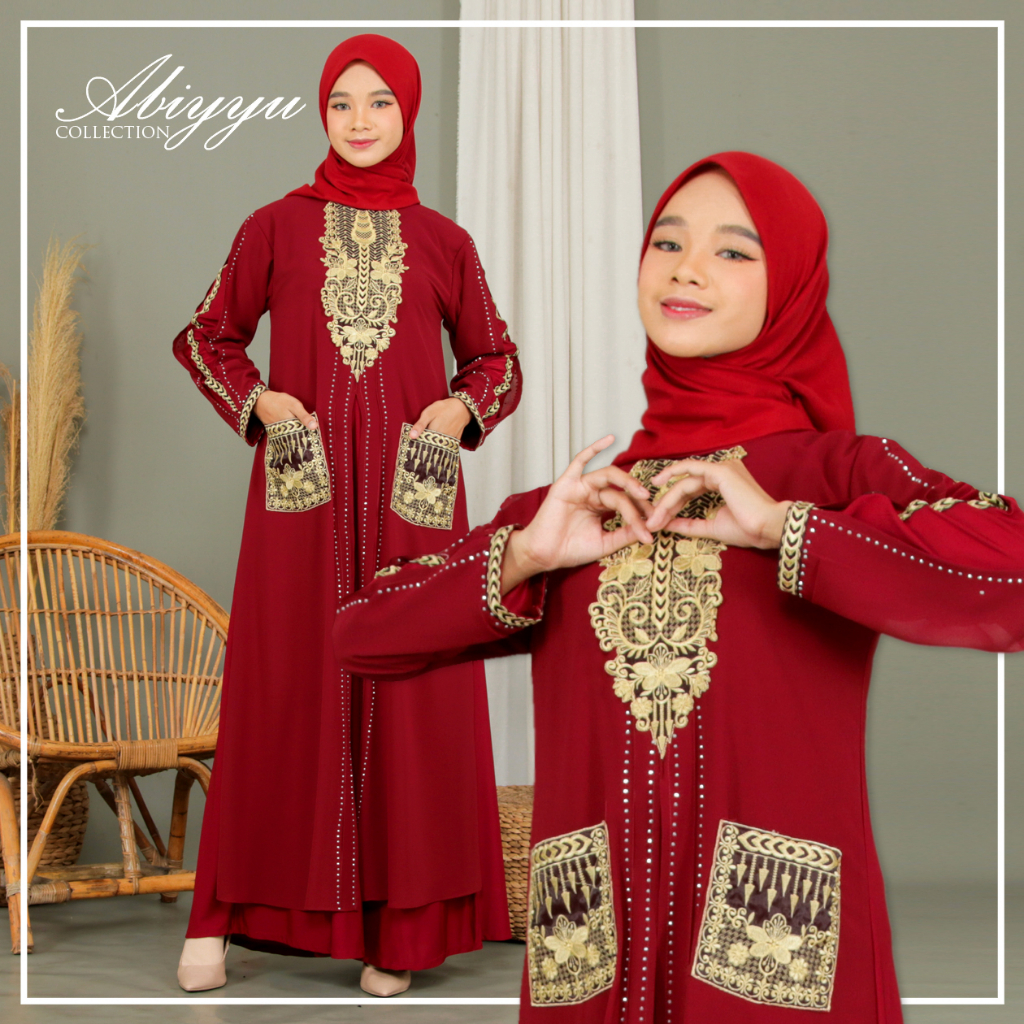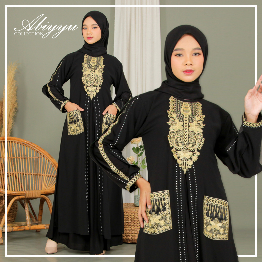 Abaya ini dibuat menggunakan bahan jersey dan ceruty. Kami memakai bahan jersey berkualitas tinggi, bahannya cukup tebal, tidak nerawang, adem, halus, dan nyaman dipakai. Bahan ceruty-nya juga halus, jatuh, dan tidak mudah kusut. Abaya ini dipercantik dengan renda/bordir tempel dan mote swarovsky. Cocok dipakai untuk pesta, arisan, ataupun acara formal.