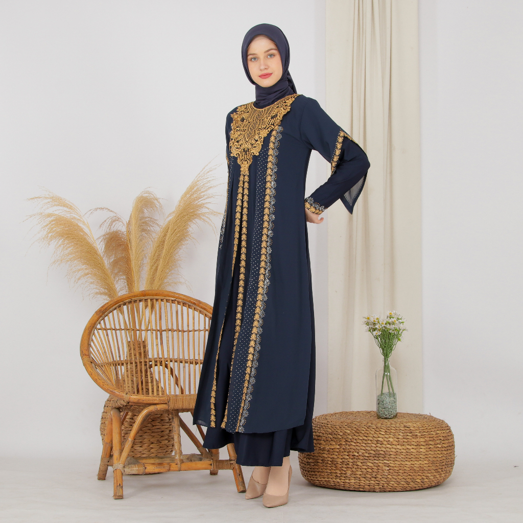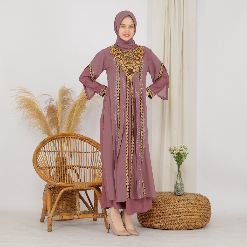 Abaya ini dibuat menggunakan bahan jersey dan ceruty. Kami memakai bahan jersey berkualitas tinggi, bahannya cukup tebal, tidak nerawang, adem, halus, dan nyaman dipakai. Bahan ceruty-nya juga halus, jatuh, dan tidak mudah kusut. Abaya ini dipercantik dengan renda/bordir tempel dan mote swarovsky. Cocok dipakai untuk pesta, arisan, ataupun acara formal.
