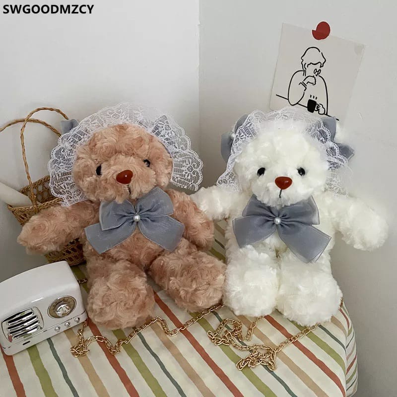 Fashion Bayi & Anak > Tas Anak Perempuan > Tas Selempang & Bahu > Abrrar Kadabra Tas Boneka Beruang Pita Tas selempang anak Muat HP Bahan Bulu Korea BISA COD