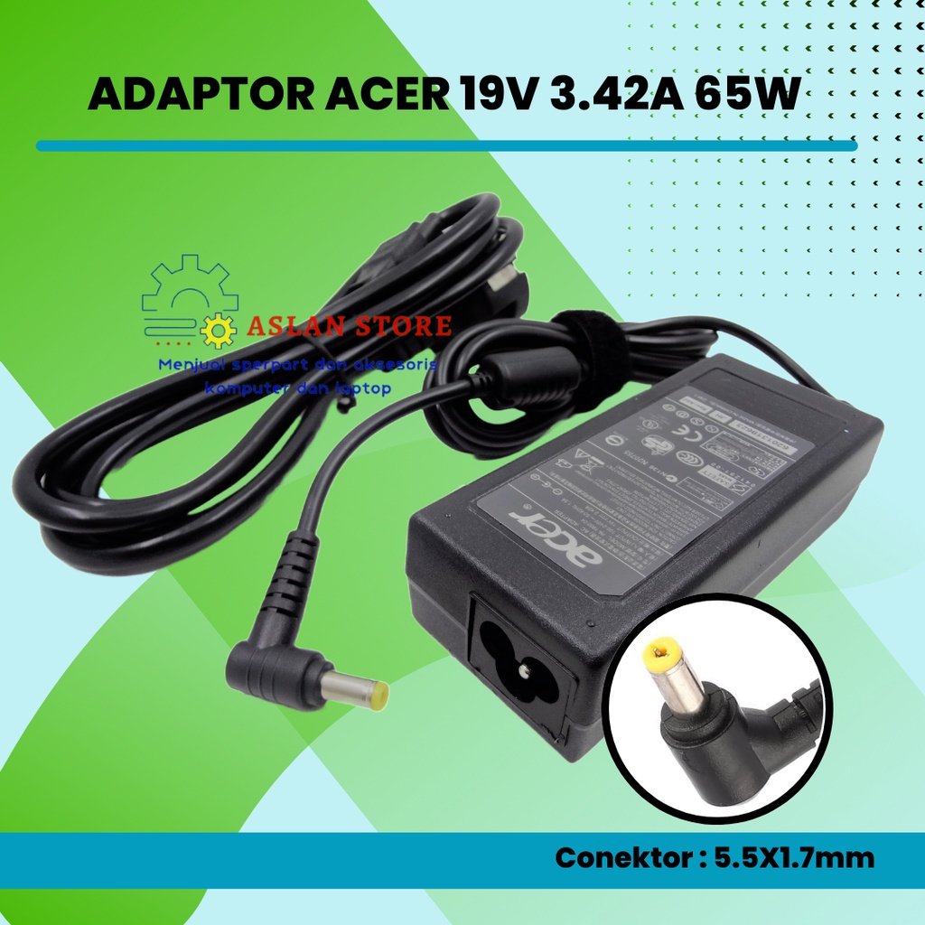 Charger acer output 19V3.42A DC 5.5*1.7mm ******************** Charger ACER dengan DC OUTPUT : 19V 3.42A Input Voltage : AC 100V-240V ~ 50-60Hz Connecter Size : 5.5 X 1.7 mm Power : 65W Tipe Produk : Original Garansi : 3 bulan (ganti baru) ********************