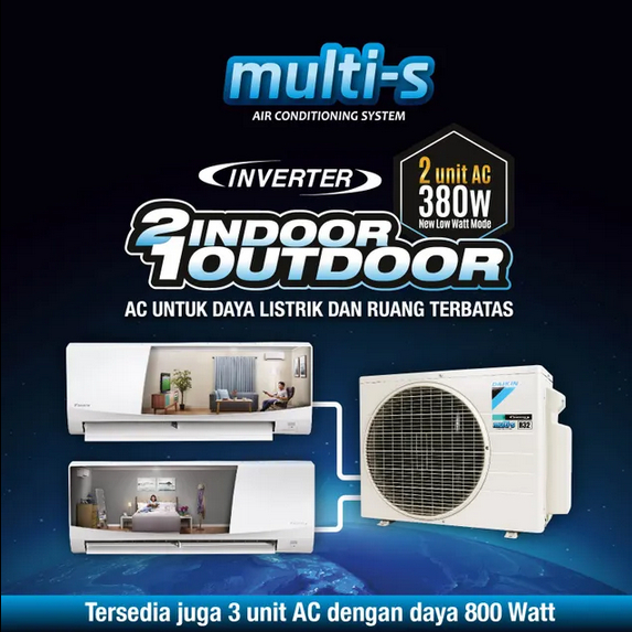 👌HEMAT TEMPAT 1 unit outdoor dapat di hubungkan dengan 2 unit indoor ⚡NEW LOW WATT MODE Dapat mengoperasikan 2 unit AC bersamaan dengan perangkat listrik lainnya dengan dua pilihan : 650w dan 380w Detail : -