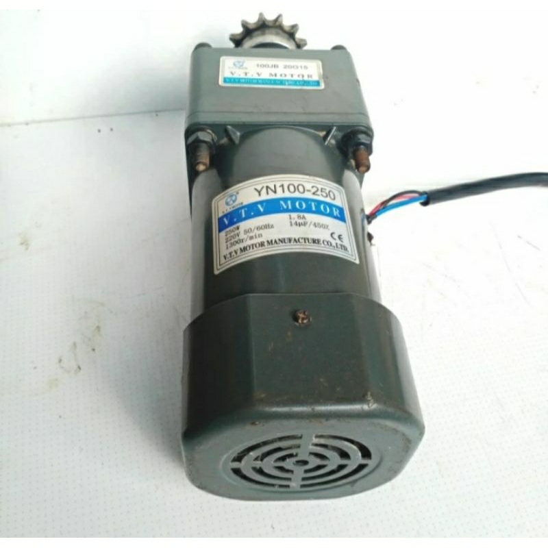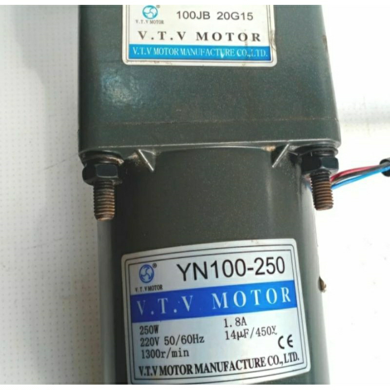 DINAMO GEARBOX-VTV MOTOR- YN100-250. AC 220 volt. 250 wat. 65 RPM. ratio 1:20. Diameter as 15 mm. panjang motor gearbox 24 cm. bessar 10 cm. VTV MOTOR MANUFACTURE COM. lebih lanjut lihat foto bisa Speed Control