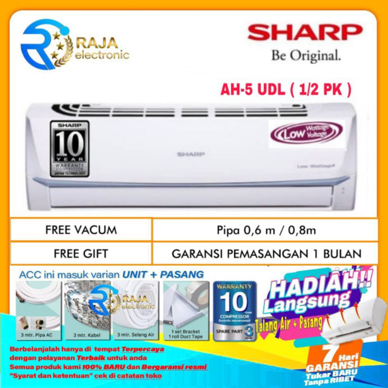 Detail AC SHARP 1/2 PK AH-AP05UDL SAYONARA PANAS LOW WATT LOW VOLTAGE + PASANG & MATERIAL